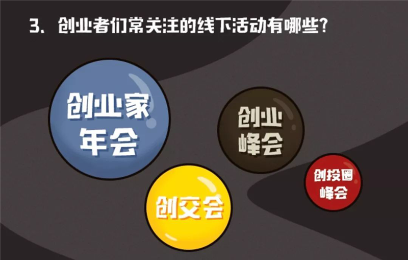 创业要有不灭的斗魂,也要有开放的思维。报告显示创业者们常常关注一些大型线下交流活动,如创业家年会、创交会、创业峰会、创投圈峰会等。既可以交流最新风向、了解行业信息,也可以展示自家形象,吸引关注。
